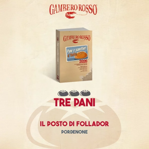 Anche quest’anno Forno Follador conquista il massimo riconoscimento nella Guida Pane e Panettieri d’Italia 2026 del Gambero Rosso, ottenendo per il terzo anno consecutivo il Premio Tre Pani, assegnato solo alle eccellenze della panificazione italiana.