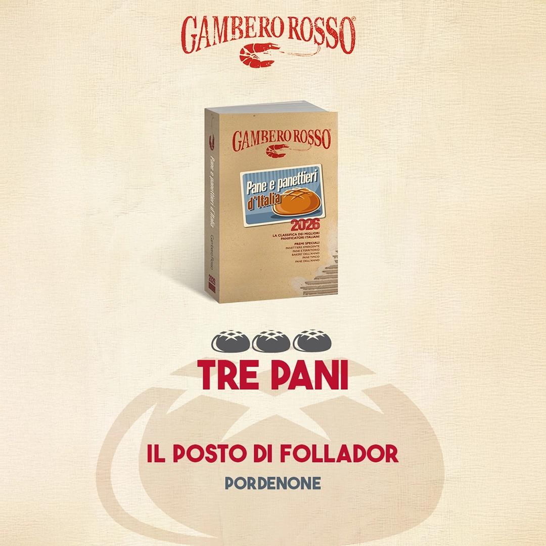 Anche quest’anno Forno Follador conquista il massimo riconoscimento nella Guida Pane e Panettieri d’Italia 2026 del Gambero Rosso, ottenendo per il terzo anno consecutivo il Premio Tre Pani, assegnato solo alle eccellenze della panificazione italiana.
