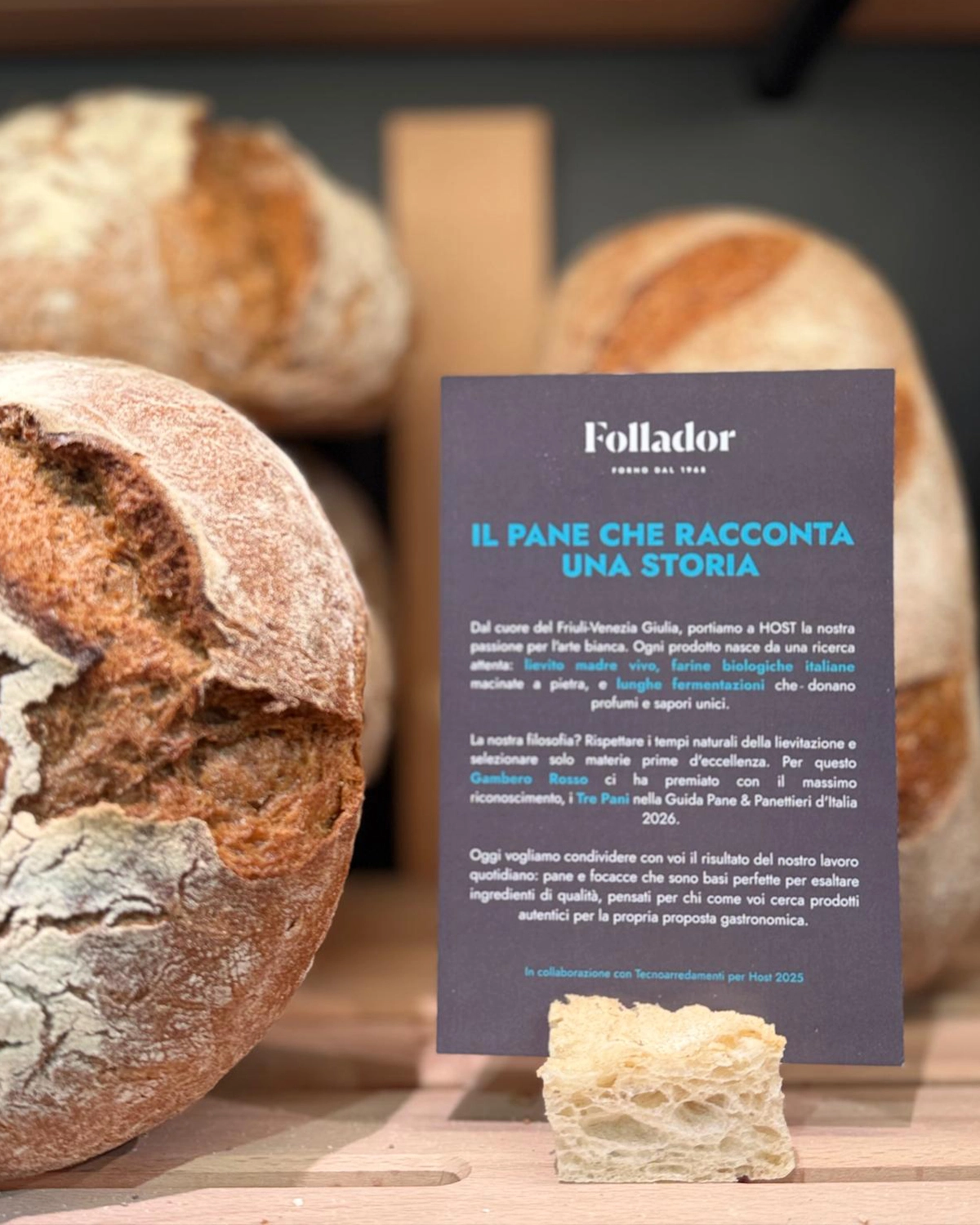“Siamo orgogliosi di aver partecipato a HostMilano, vetrina di riferimento per l’ospitalità e il food retail, insieme a Tecnoarredamenti, realtà pordenonese come la nostra e partner di fiducia da anni. Apprezziamo il loro modo di mettere al centro le esigenze del cliente, proponendo soluzioni innovative che combinano estetica, funzionalità e tecnologia. A chi è venuto a trovarci abbiamo proposto una selezione dei nostri pani, focacce e basi per pizza presentati in un ordine di degustazione studiato per esaltare consistenze e sapori, e accompagnati da una selezione delle migliori eccellenze nazionali e del nostro territorio.” afferma Antonio Follador.