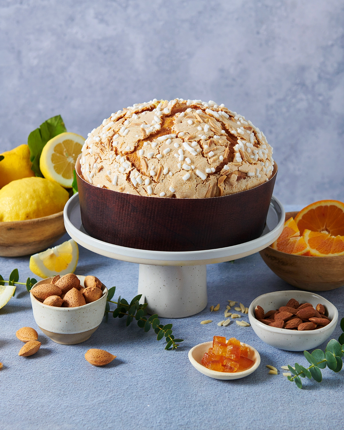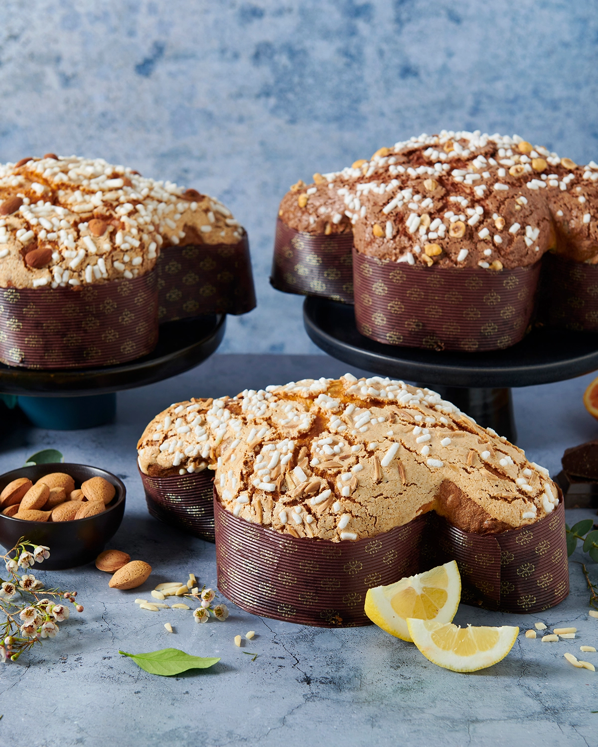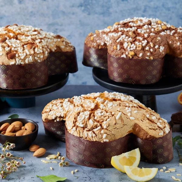 Completano la proposta la Colomba Arancia e Cioccolato, con fondente al 60% e arance candite, rifinita da glassa al cacao con zucchero in granella e nocciole, e la Colomba Mandorla e Limone, arricchita con pasta di mandorle e limone candito di Sorrento, avvolta da una copertura croccante di zucchero e bastoncini di mandorle.