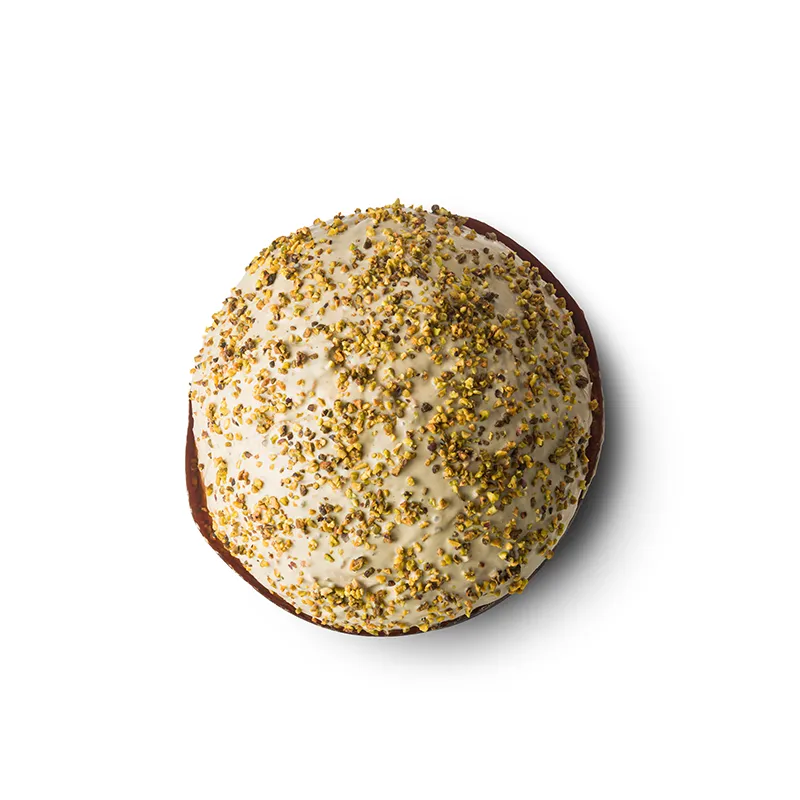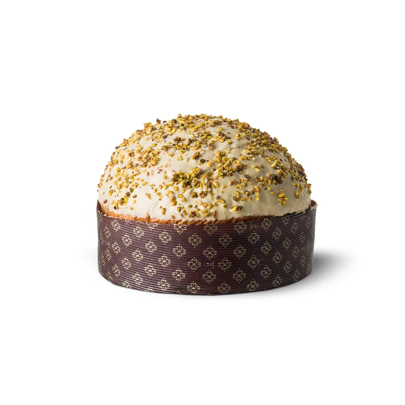 Il panettone si arricchisce di una preziosa farcitura di pasta al pistacchio di Bronte DOP pura al 100% lavorata a cremino e di una golosa e croccante glassa di cioccolato bianco al pistacchio e granella. È lavorato, secondo tradizione, con lievito madre da rinfresco.