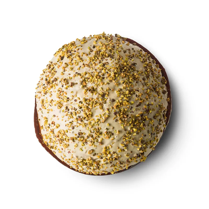 Il panettone si arricchisce di una preziosa farcitura di pasta al pistacchio di Bronte DOP pura al 100% lavorata a cremino e di una golosa e croccante glassa di cioccolato bianco al pistacchio e granella. È lavorato, secondo tradizione, con lievito madre da rinfresco.