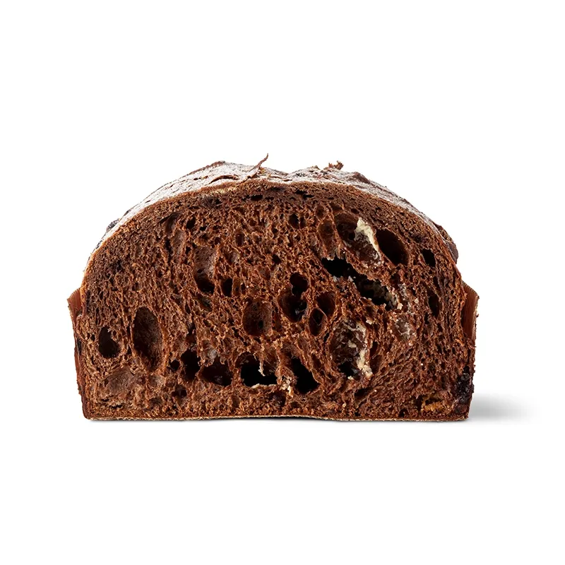 Un impasto al cacao che conserva la classica sofficità del panettone e si arricchisce della golosa presenza di gocce di cioccolato fondente, di cioccolato bianco e amarene candite dal gusto dolce e lievemente acidulo. Prima del taglio, è da spolverizzare con il mix di zucchero a velo Polvere di Stelle in abbinamento: Ciock Follador al profumo e gusto di cacao e latte.